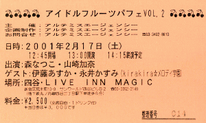 Idol Fruits Parfait is a minor idol event held by Artemis Promotion. It is a song stage by some of the minor Artemis idols. But on February 17, 2001, one of the guests were Asu-Kasu-Mi ( Itou Asuka (伊藤あすか) and Nagai Kasumi (永井かすみ) ) of Kira Kira Melody Gakuen. There were only about 50 people total. I would estimate 20 or so were Kira Melo fans, and the rest were Artemis fans. There were about five rows of chairs, but many people stood. I sat in the third row, dead center. The event began, and Asuka and Kasumi came onto the stage. Kasumi was wearing a red, hooded sweatshirt top, checkered mini skirt (very short), loose socks, and back hi-top gym shoes. (VERY CUTE!!) Asuka was wearing a blue, hooded sweatshirt top, brown-ish mini skirt, loose socks, and white gym shoes. Kasumi stood on the left, and Asuka stood on the right. Asuka and Kasumi introduced themselves as Asukasumi. They sang Makka na Jitensha, an old idol song by Onyanko Club. Before singing the next song, Asuka said that it was a song by a group of short girls. Kasumi said, "Heart Chu!" (^_^; But then they said that it was a smaller group.. The song was Jan Ken Pyon, the current song by Mini Moni. Kasumi said that she thought up the dance for the first two songs, while Asuka was sleeping. The next song was Pride. Then Kasumi and Asuka announced that the album Dear+Palette-Che will go on sale 2/28. Asuka was a new member of Muteki Palette, so she will have a song on that album. Also Muteki Palette will have a campaign event on 3/17. They also announced that the break up event of Kira Kira Melody Gakuen will take place on 3/25. They said that it will be a very long event. The last song for Asukasumi was Daisuki, the remix version that was sung at the Christmas live in 2000. Then Asu-Kasu-Mi left the stage. The next singer was Yamazaki Kana, who sang two songs. She also announced that she was going to quit Artemis Promotion at the end of March. After Kana, Mori Natsuko came onto the stage. She sang three song, but she was crying the whole time. Natsuko said that she was also quitting Artemis Promotion at the end of March. At the end, Natsuko and Kana sang a medley of song by other Artemis idols (Fancy Free Flamingo, Suzuki Marie, Tokunaga Ai, Mizuno Aoi).