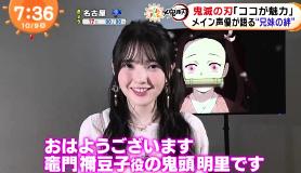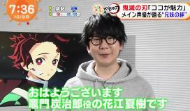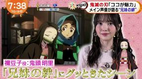 On the 10/9 broadcast of Mezamashi TV, there was a collaboration corner with the anime Kimetsu no Yaiba. There were video clip interviews with Hanae Natsuki and Kitou Akari. This was the first day (out of six) of the collaboration. The theme for today was "kyoudai no kizuna", the bond of the brother and sister.
